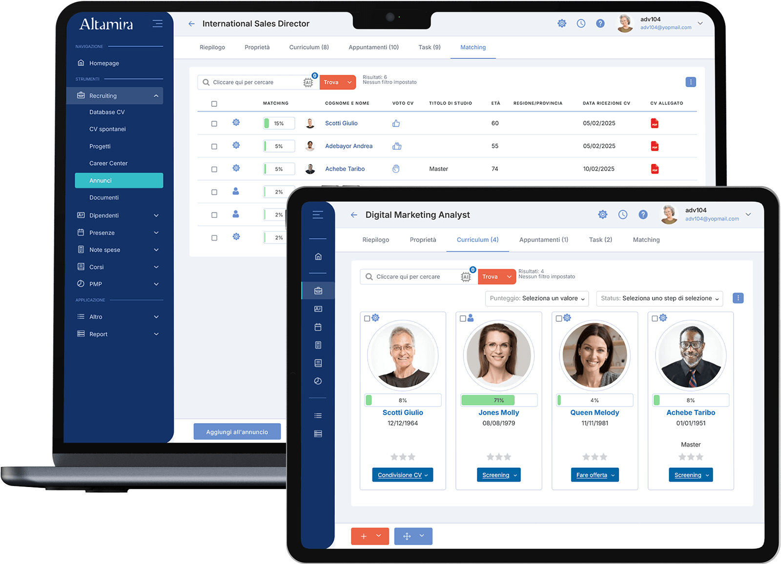 - CV Matching. Questa utilissima funzionalità mostra automaticamente i candidati più in linea per una posizione aperta, incrociando i requisiti richiesti (in termini di competenze ed esperienze lavorative) con i CV ricevuti. Non solo, permette anche di identificare i curricula più affini tra quelli già presenti in database, dando valore ai dati archiviati negli anni.